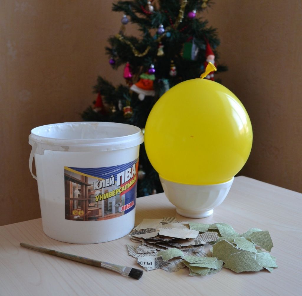 Небольшие кусочки старых бумажных обоев нам нужны для усиления прочности шлема, мы будем их переслаивать с газетной бумагой. Вместо обоев может подойти крафт-бумага. Обычно для данной техники берется клейстер, но мы возьмем клей ПВА, это сделает шлем более крепким.