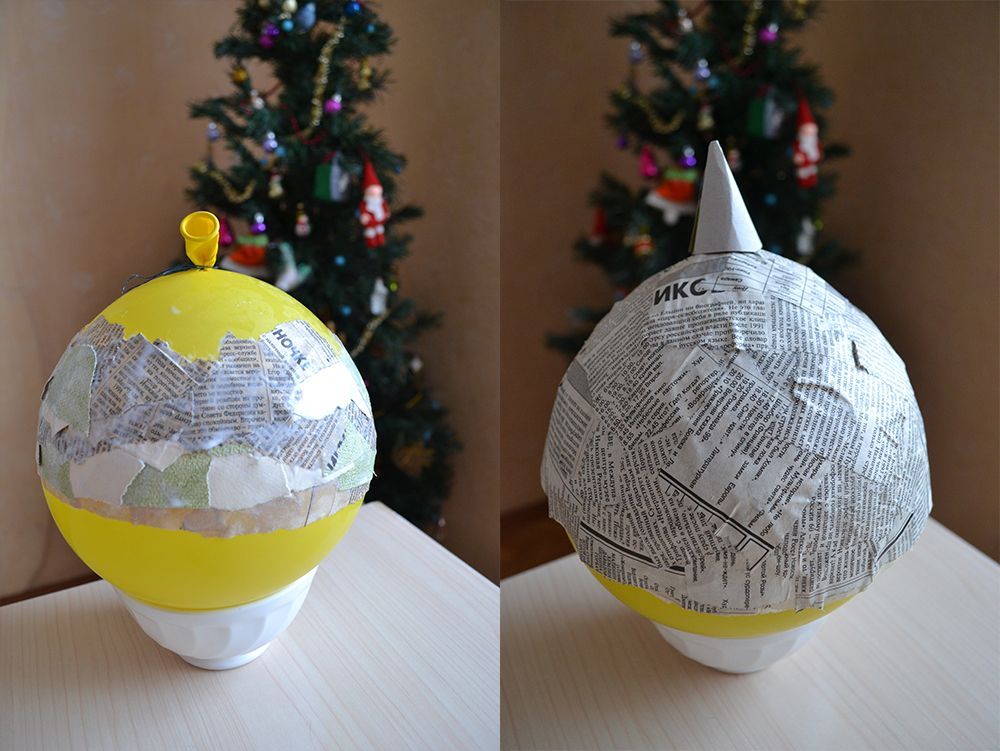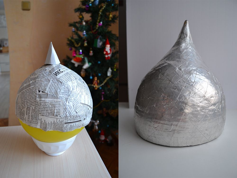 Из картона нужно сделать небольшой конус высотой 4-5 см. После пятого наклеенного бумажного слоя, приклеим конус к верхушке нашего изделия. Далее обклеиваем заготовку уже вместе с конусом. Всего нужно приклеить 8-10 слоев, тогда наш шлем станет очень прочным и выдержит любой удар детского меча. Готовое изделие просушим при комнатной температуре не меньше суток, далее мелкой наждачной бумагой затрем все неровности. Ножницами выровняем нижний край изделия. Затем длинную полоску металлизированного скотча приклеим на нижний край изделия, подвернув её внутрь на 1,5-2 см. Далее небольшими кусочками строительного скотча обклеим готовое изделие снизу вверх.