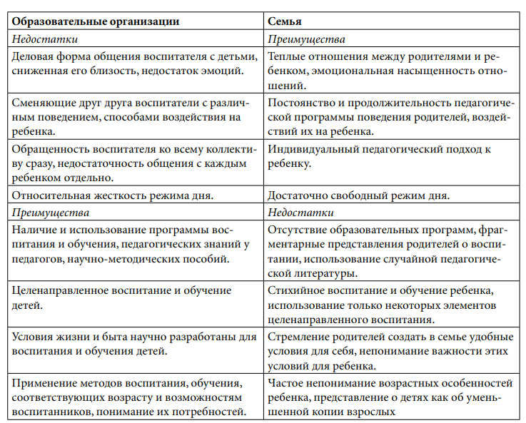 Покажем некоторые преимущества и недостатки образовательных учреждений и семьи как института воспитания с помощью таблицы.