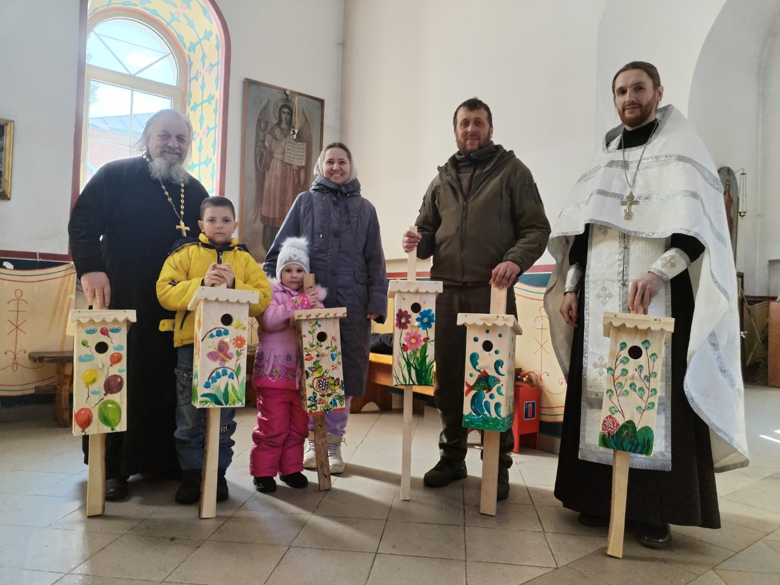 Специально к поездке ребята изготовили ещё пять домиков для птиц и расписали их под руководством руководителя изостудии воскресной школы Людмилы Гетман.